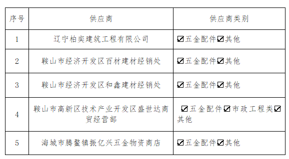 根據2024年5月11日發布的《供應商入庫公告》要求,經過報名篩選和資質審查等程序,確定了5家供應商符合入庫條件。現公布經過篩選的供應商入庫清單,名單如下: